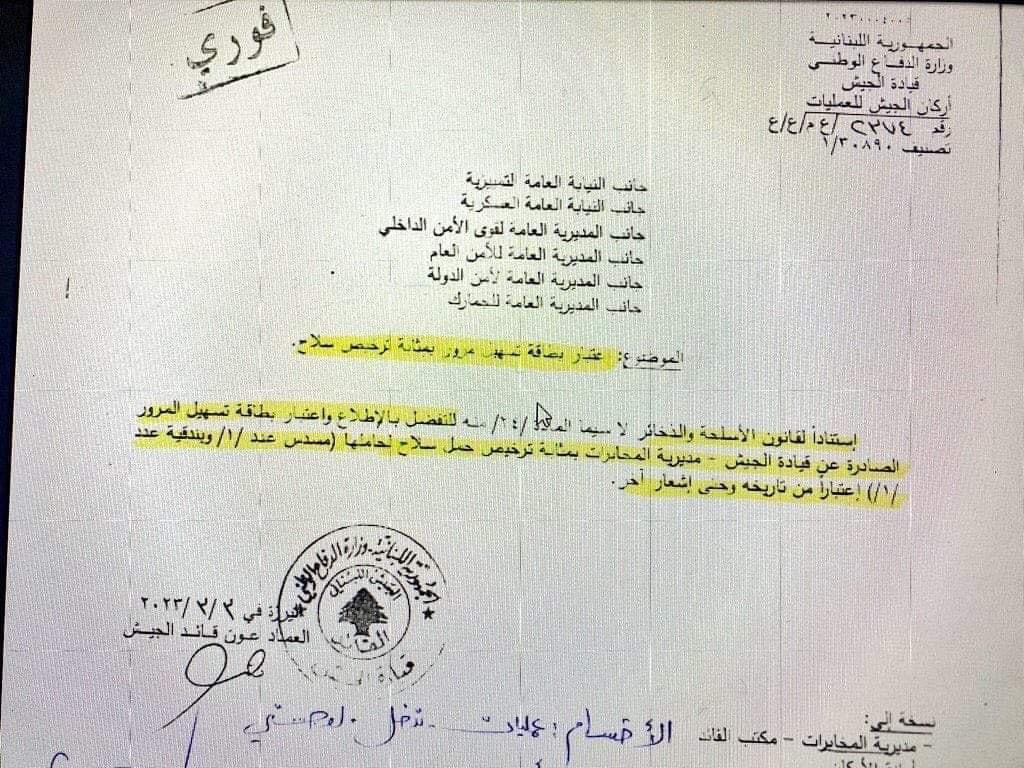 في ظهوره الاخير نفى وزير الدفاع موريس سليم اي خلاف مع قائد الجيش وتحاشى الدخول في اي نقاش حول الامر ، لكن الحقيقة عكس ذلك تماماً فالخلاف يتفاعل وينتقل الى مراحل متقدمة والقرار الاخير لقائد الجيش المتعلق بترخيص الاسلحة ما هو الا دليل على عمق الفجوة بين الطرفين حيث استعاض جوزيف عون بتكاليف تسهيل المرور الصادرة عن مديرية المخابرات واضاف اليها منح حاملها رخصة نقل سلاح فردي معتبرا التسهيل بمثابة ترخيص بحد ذاته وهذا ما يعتبر حالة استثنائية لم يشهدها لبنان سابقا خاصة لجهة اصدار التراخيص العسكرية القانونية حيث تصدر رخصة حمل السلاح فقط عن وزير الدفاع ويوضع عليها اسمه وتوقيعه !!